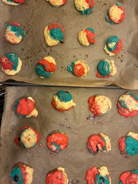 When combining the three into one you can use your preferred method for making swirl cookies. The scoop method worked well for me and I got into a good groove doing it that way.